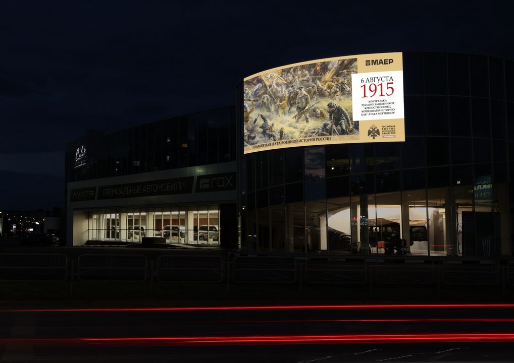 Одним из первых на новых медиафасадах в Челябинске стартовал флагманский проект МАЕР «Памятные даты военной истории» реализуемый совместно с Российским военным историческим обществом.