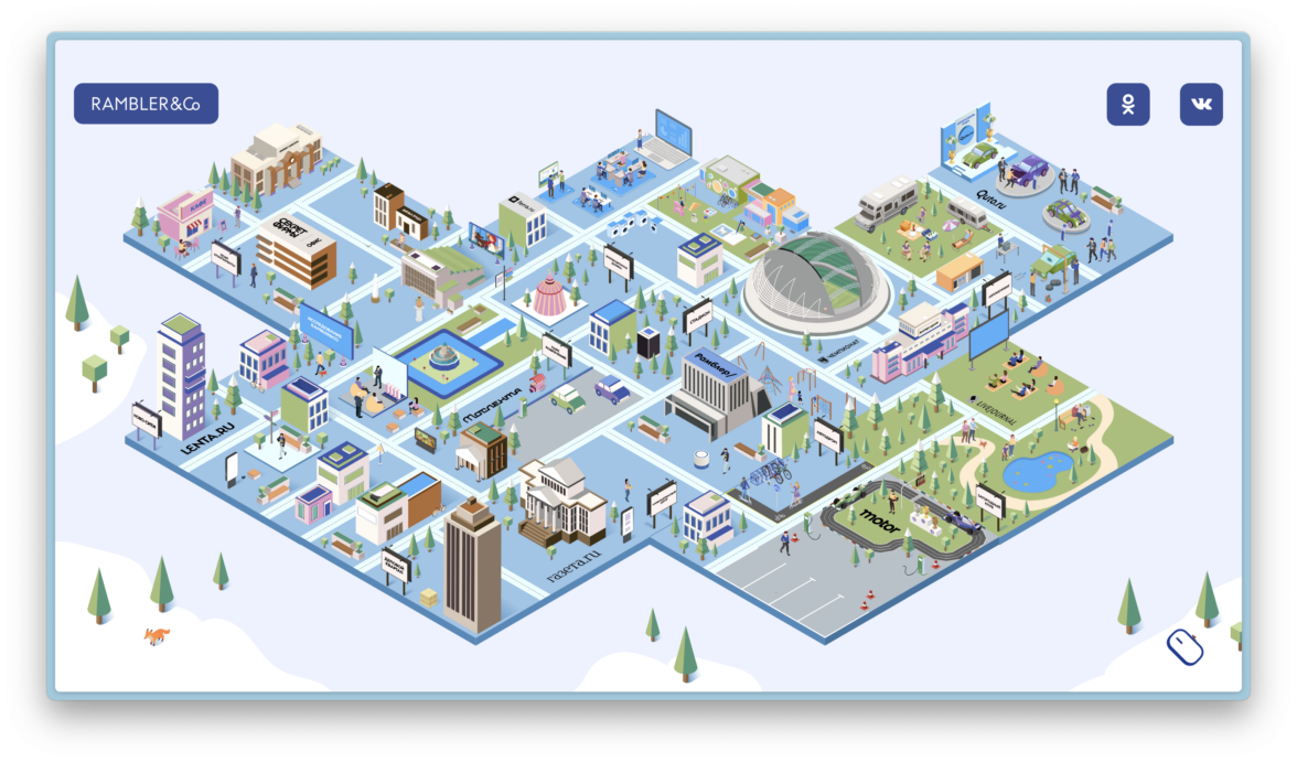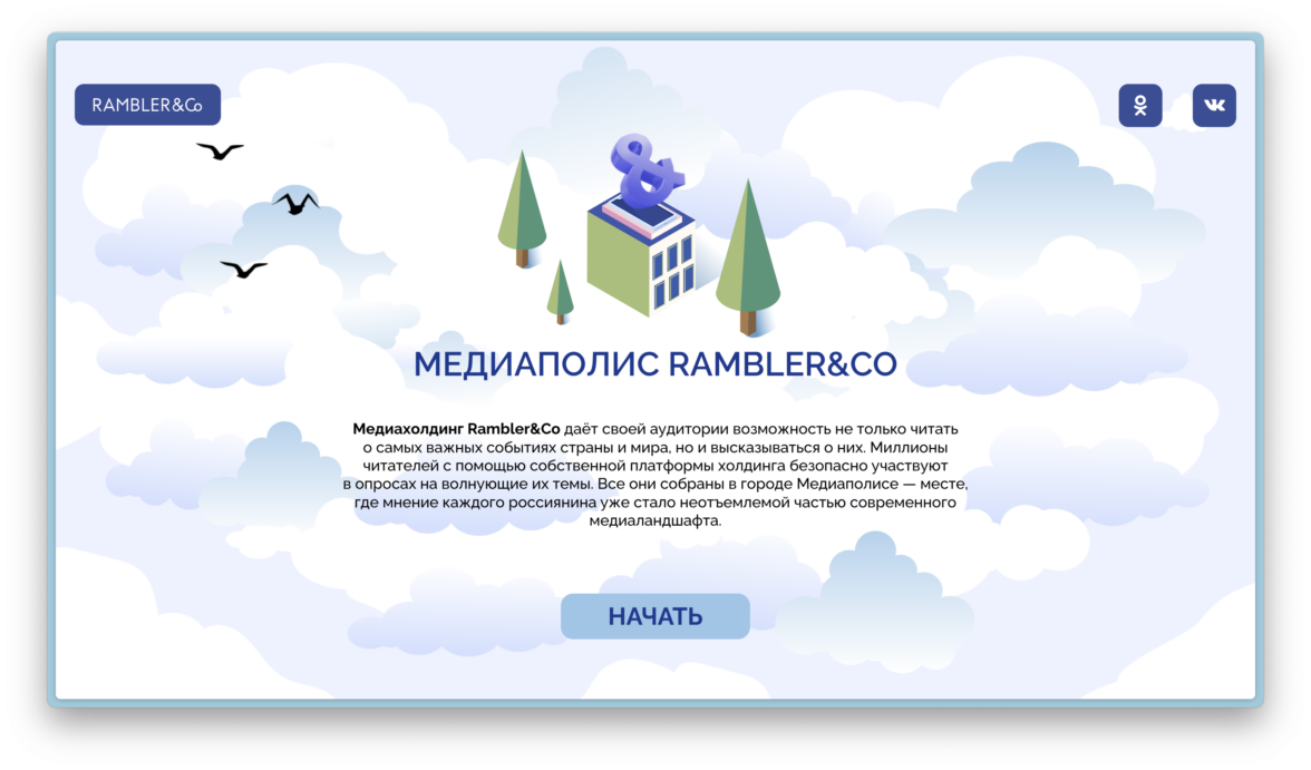 Аналитики Rambler&Co на протяжении года собирали статистику самых интересных опросов. Их оказалось так много, что они затронули каждый аспект жизни современного жителя мегаполиса. Медиахолдинг представил их в виде виртуального города, где у каждого актива есть свой район, в котором расположены объекты, связанные с темами исследований. Куда россияне любят ходить на свидания? Сколько часов в день проводят в интернете? Как отдыхают и заботятся об экологии? В Медиаполисе от Rambler&Co можно найти ответ!