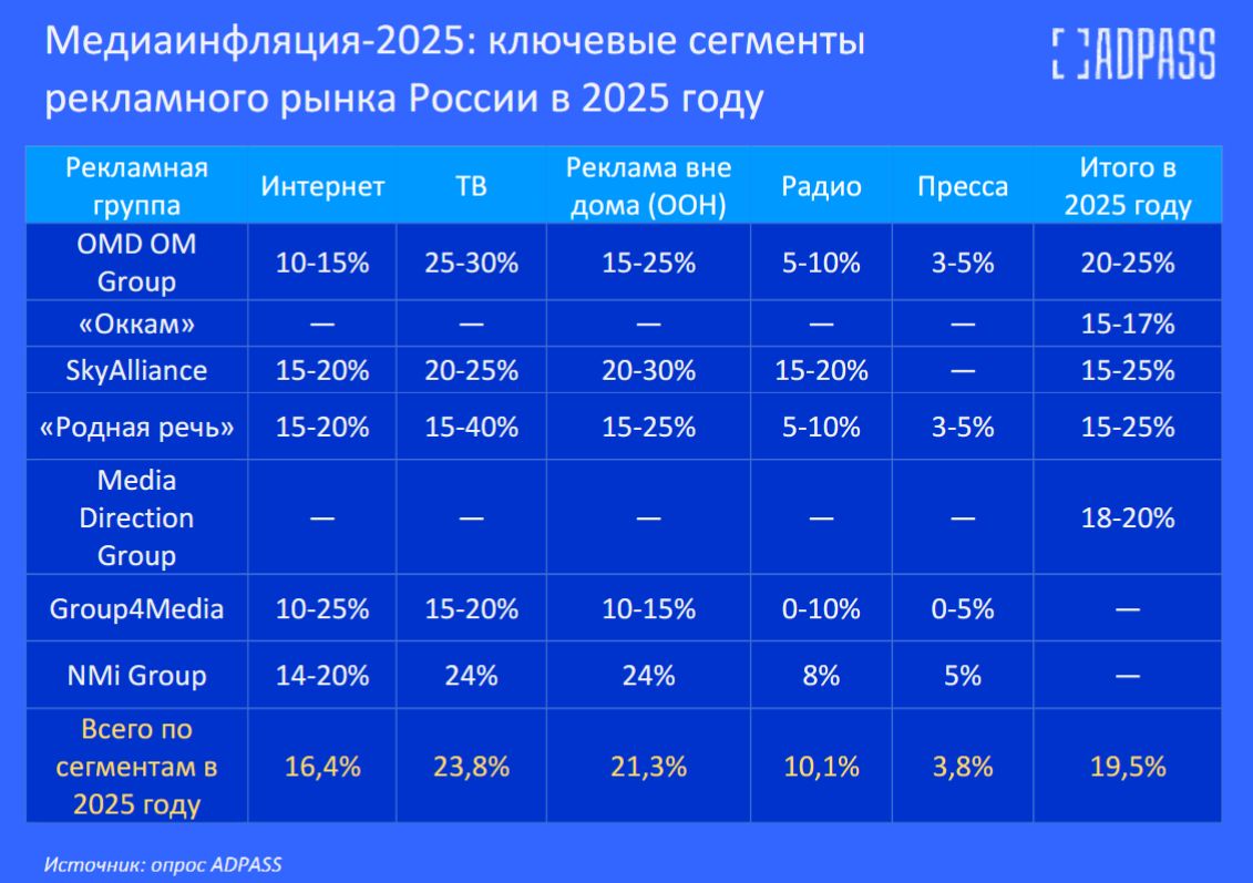 ADPASS опросил российские рекламные группы из первой десятки рейтинга Ассоциации коммуникационных агентств России (АКАР) и портала Sostav. По оценке семи рекламных групп из числа крупнейших, средняя медиаинфляция в России в 2025 году составит около 20%: от 15% до 25% к уровню цен 2024 года.