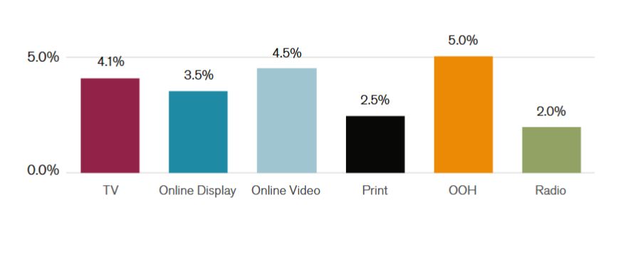 По данным ECI Media Management, в 2025 году на глобальном уровне динамика роста цен на рекламу снизится почти для всех медиаканалов, за исключением рекламы вне дома (OOH). Медиаинфляция в этом сегменте останется на уровне 2024 года — 5%.