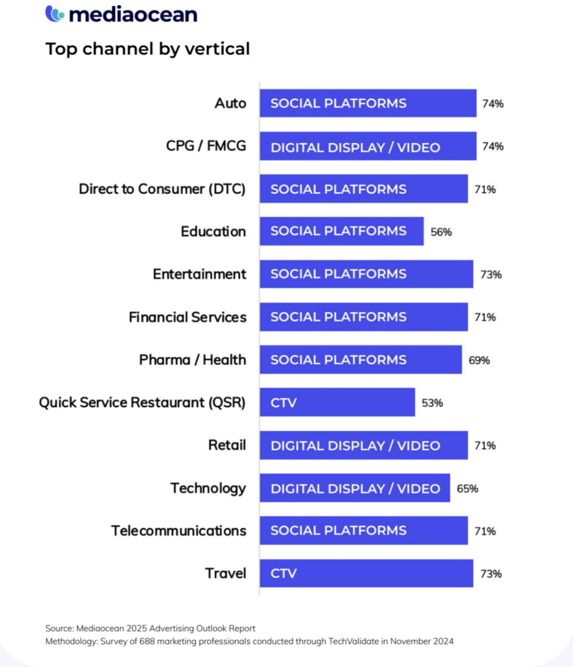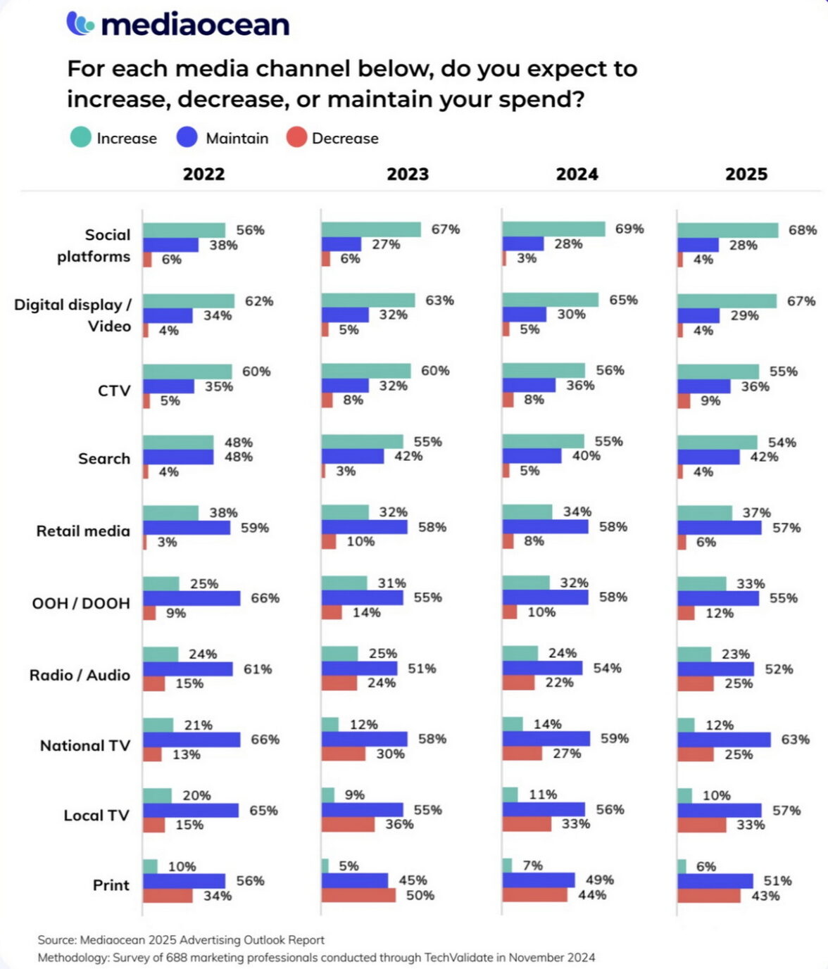 Исследования Mediaocean показывают, что оптимистический настрой, царивший в отрасли в 2024 году, сохранится и в 2025 году. Социальные сети, цифровые экраны и подключенное телевидение (CTV, просмотр на устройствах, подключенных к интернету) остаются самыми быстрорастущими сегментами с постоянным ростом инвестиций, который соответствует вовлеченности потребителей и затраченному времени.
