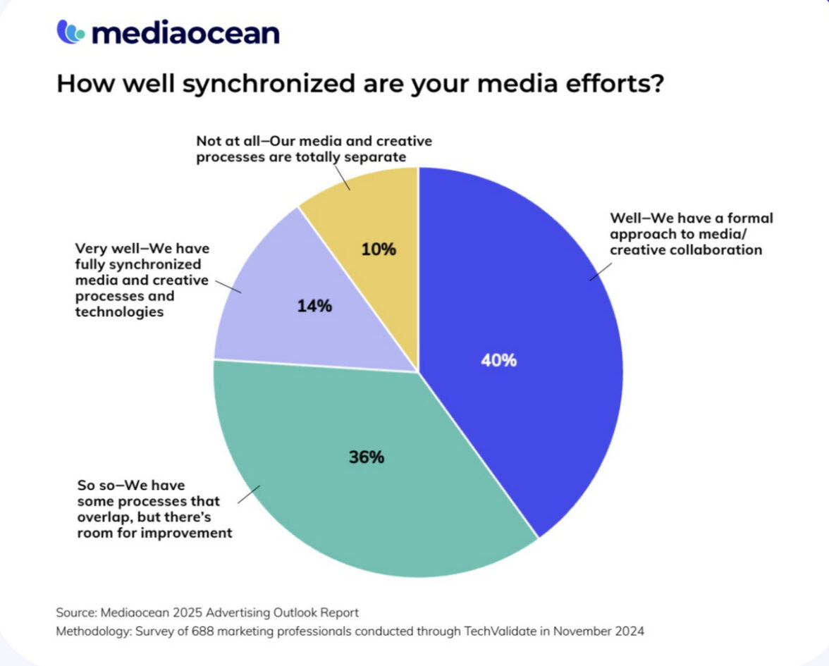 Полная синхронизация медийных и креативных процессов остается в 2025 году относительно редким явлением, хотя по сравнению с 2024 годом ситуация немного улучшилась. Только 14% респондентов ответили, что данные процессы и технологии в их компании полностью синхронизированы. О формальном подходе к этому вопросу заявили 40% опрошенных. Частичную синхронизацию с возможностями для улучшения ситуации отметили 36% респондентов. 10% опрошенных ответили, что у них подобная синхронизация отсутствует.