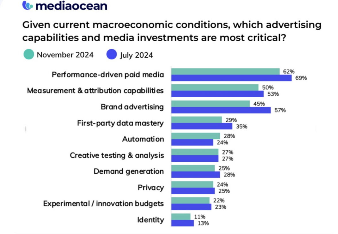 На вопрос «С учетом нынешних макроэкономических условий, какие рекламные возможности и инвестиции в медиа являются самыми важными?» самый частый ответ выглядел так — эффективная платная реклама. Его дали 62% опрошенных. Второй по популярности ответ — возможности измерений и аттрибуции (50% респондентов). 45% заявили о важности рекламы бренда. Владение собственными данными считают важным 29% респондентов, автоматизацию — 28%, креативное тестирование и аналитику — 27%, генерацию спроса — 25%, приватность — 24%, выделение бюджетов на эксперименты и инновации — 22%, идентичность — 11%.