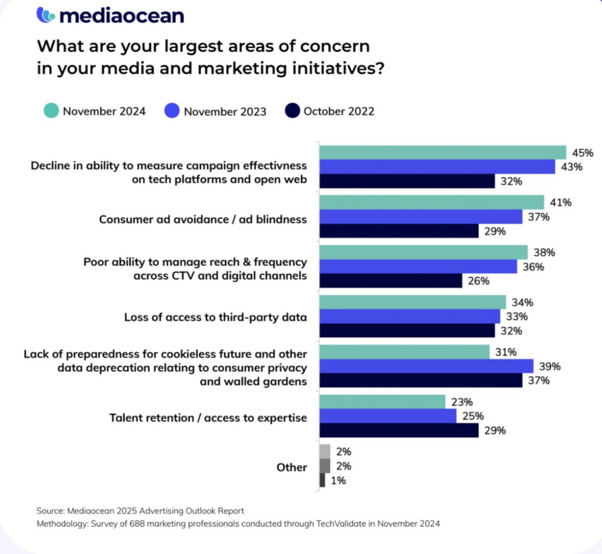 Главной проблемой, мешающей развитию их медиа- и маркетинговых инициатив, 45% участников опроса назвали «снижение возможностей измерять эффективность кампании на технологических платформах и в открытом интернете». Второе по значению опасение (его высказали 41% респондентов) — избегание пользователями рекламы, игнорирование рекламных объявлений. 38% респондентов заявили о том, что их волнуют низкие возможности управления охватом и частотой контактов с пользователями в CTV и цифровых каналах. 34% респондентов опасаются потери доступа к данным третьих лиц. 31% переживают из-за неготовности к будущему без куки и других мер обеспечения приватности пользователей. 23% волнуются по поводу удержания талантливых специалистов.