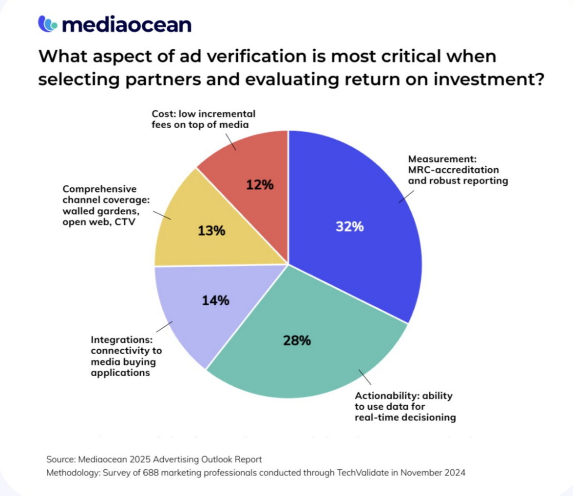Отвечая на вопрос: «Какой аспект верификации рекламы является для вас самым критически важным при выборе партнеров и оценки окупаемости инвестиций?», 32% респондентов выбрали ответ «Измерение. Показ с аккредитацией Совета по медиаизмерениям (Media Ratings Council, MRC) и надежная отчетность». 28% опрошенных высказались за действенность — возможность использования информации для принятия решений в режиме реального времени. 14% респондентов назвали интеграции — подключение к приложениям для медиабаинга.13% выделили покрытие всех каналов — «огороженные сады», открытый интернет, CTV. Для 12% респондентов важны низкие дополнительные расходы при использовании медиа