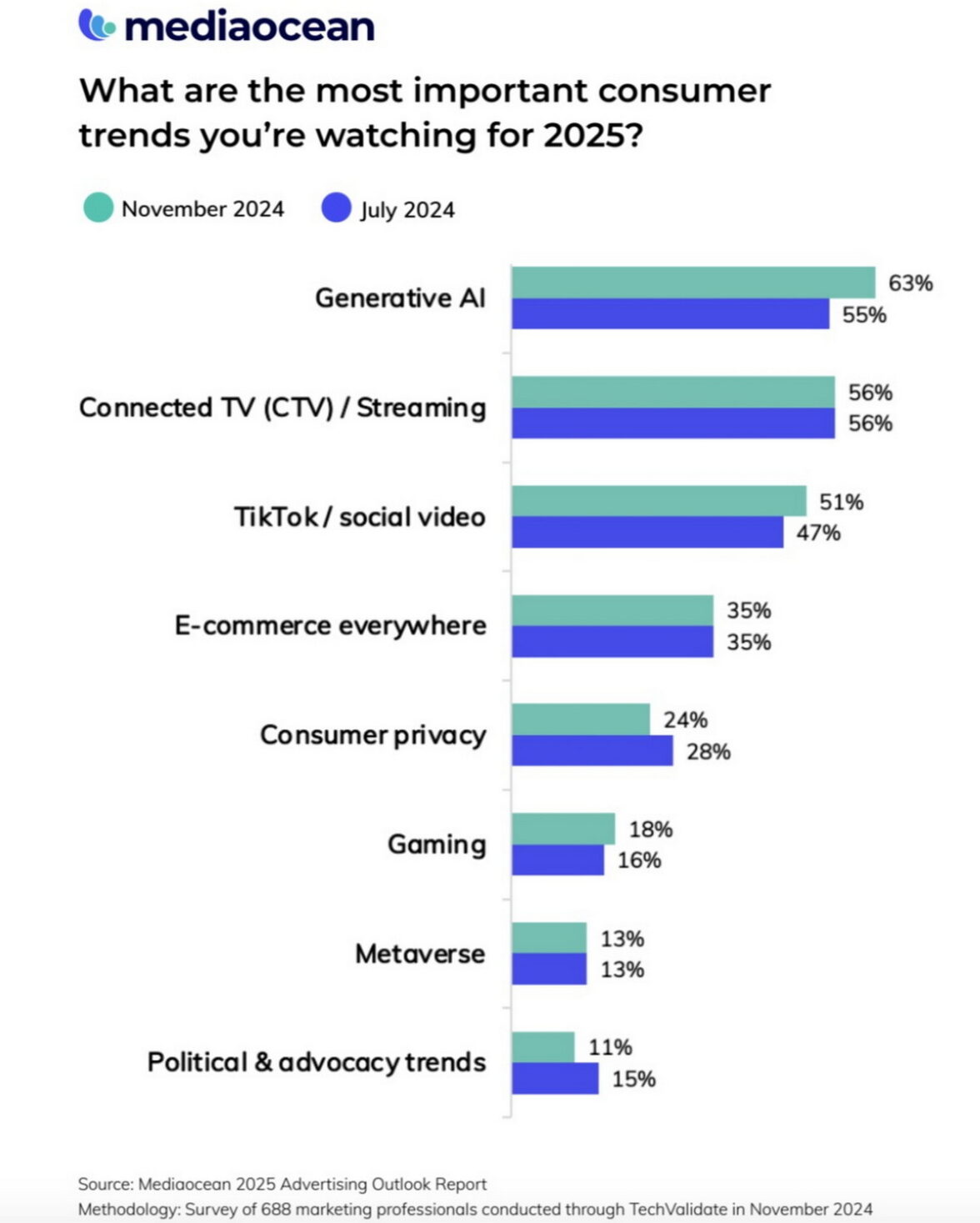 Быстрое развитие технологий искусственного интеллекта (ИИ) привело к тому, что генеративный ИИ станет самой важной потребительской тенденцией 2025 года — по мнению 63% опрошенных Mediaocean маркетологов. В прошлом опросе на первом месте стояло подключенное телевидение.