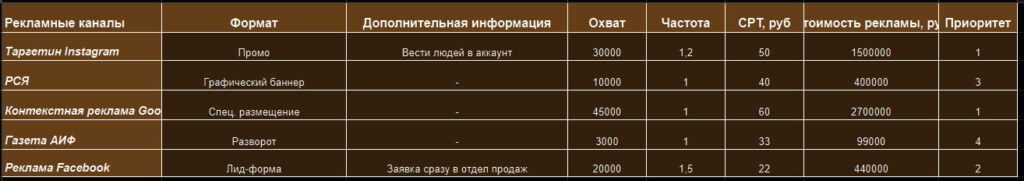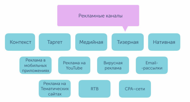 Рекламные каналы. Это названия конкретных площадок, на которых находится ваша целевая аудитория, где будет размещаться реклама.