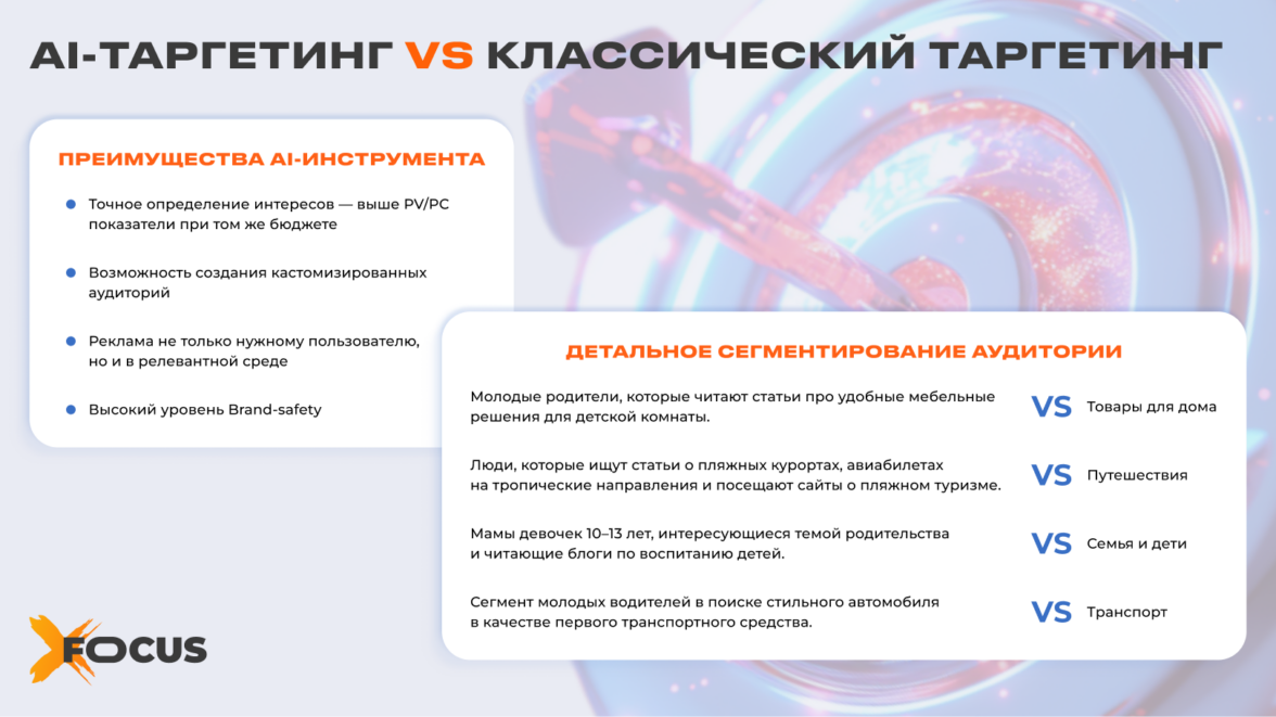 Например, клиенты XFocus используют ИИ-инструменты платформы для составления медиапланов с учетом последних инфоповодов, а также внедряют AI-таргетинг при запуске кампаний. Инструмент позволяет находить новые, узкие сегменты целевой аудитории, которым будет релевантно рекламное предложение. Также перед запуском креативов эксперты XFocus с помощью ИИ-инструмента AICAP Predict выявляют лучшие варианты, что напрямую влияет на конверсии.