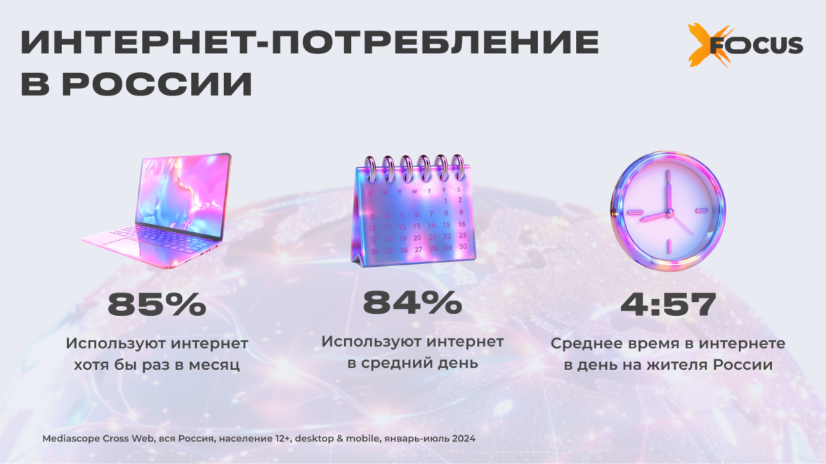 В 2024 году 20% времени, проведенного в интернете, российские пользователи тратили на видеосервисы, 16% — на социальные сети, 16% — на мессенджеры, 8% — на игры и 4% — на e-commerce.