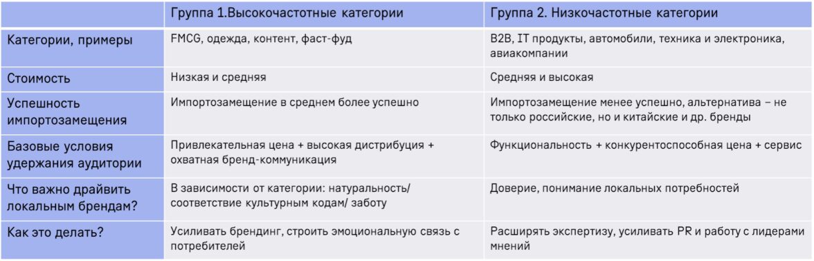 Что делать локальным брендам в такой ситуации? Как минимум, не надеяться, что обратного переключения не будет. Будет. Как максимум — разработать стратегию в зависимости от категории, конкуренции и ценового сегмента. Для первой группы, высокочастотных брендов, важно соблюдать баланс: привлекательная цена, высокая дистрибуция, охватная бренд-коммуникация. В коммуникации, в зависимости от категории, можно делать акцент на натуральность и региональное производство, например, для продуктовых категорий, на понимание культурных кодов и актуальных потребностей аудитории – для контента и фэшн. Все это неразрывно связано с выстраиванием сильного бренда помимо развития качественного продукта. Для второй группы категорий цена ошибки выше и поэтому на первый план выходит функциональность, конкурентоспособная цена и сервис. Эти базовые характеристики строят доверие, но на него также можно работать и в медиа: через экспертов и лидеров мнений.