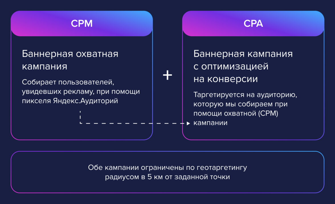 Идея была в том, чтобы параллельно запустить медийную CPM-кампанию и СPA-кампанию с текстово-графическими баннерами. Медийную кампанию мы запустили через programmatic-аукцион Директа, по модели CPM. У нее было две задачи: охватный маркетинг и сбор пользователей, увидевших рекламу, при помощи пикселя.