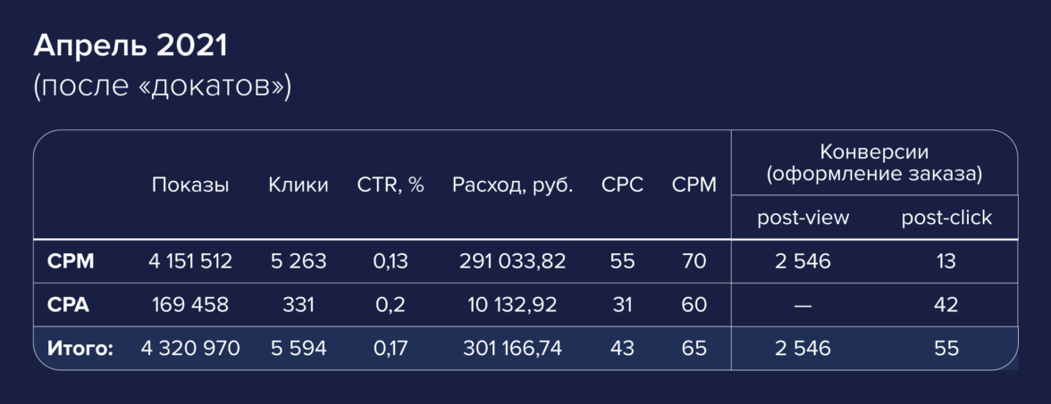 Тестовый запуск продлился месяц. Сразу по его итогам мы получили одну post-click конверсию из CPM-кампании и 10 post-click конверсий из CPA-кампании. Но самое интересное было впереди.