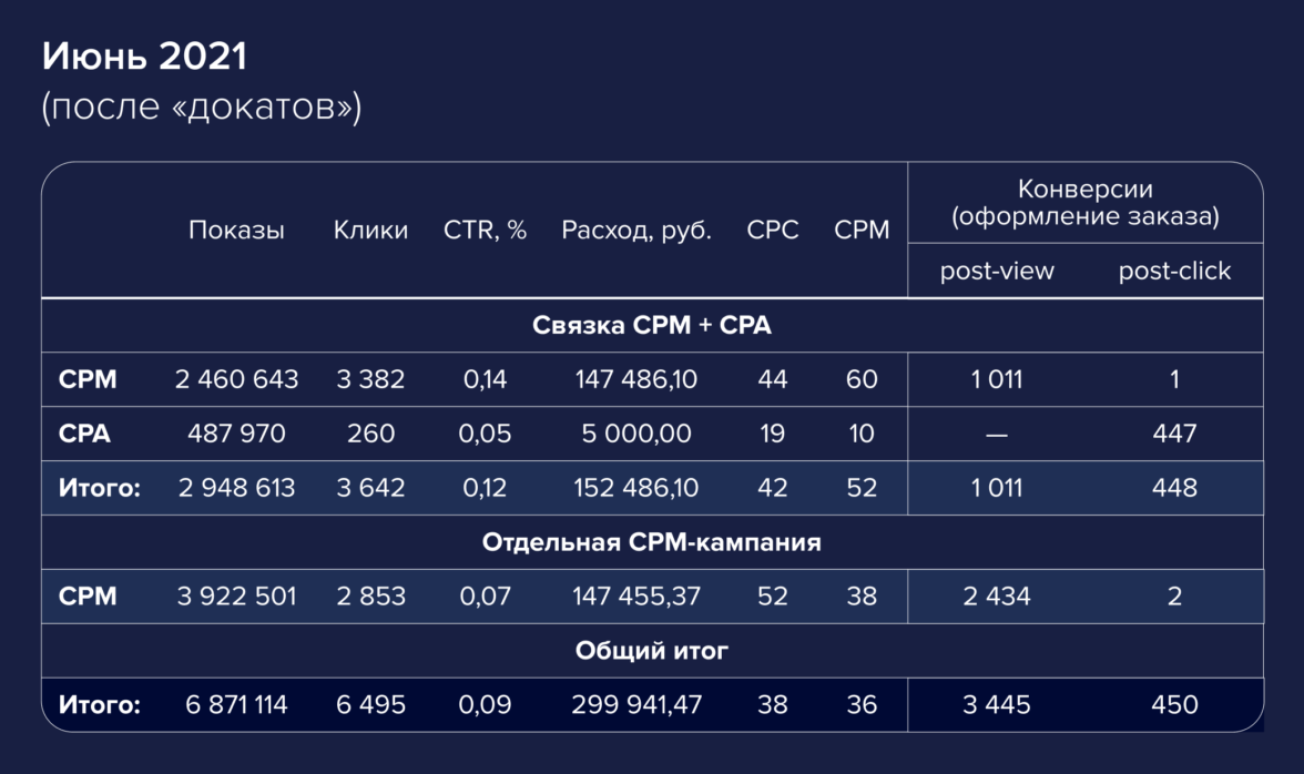 Спустя три недели мы вновь подвели итоги. «Докаты» получились очень значительными. В CPA-кампании стало 447 post-click конверсий. Общее число post-view конверсий выросло в два раза и достигло 3 445.