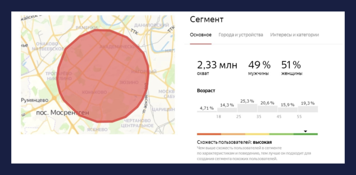 Сложность заключалась в том, что предложение скидки должно было работать на ограниченной территории — в нескольких районах Москвы. Другими словами, нам нужно было использовать гиперлокальный таргетинг, что сразу сузило круг доступных инструментов до рекламной платформы Яндекса.