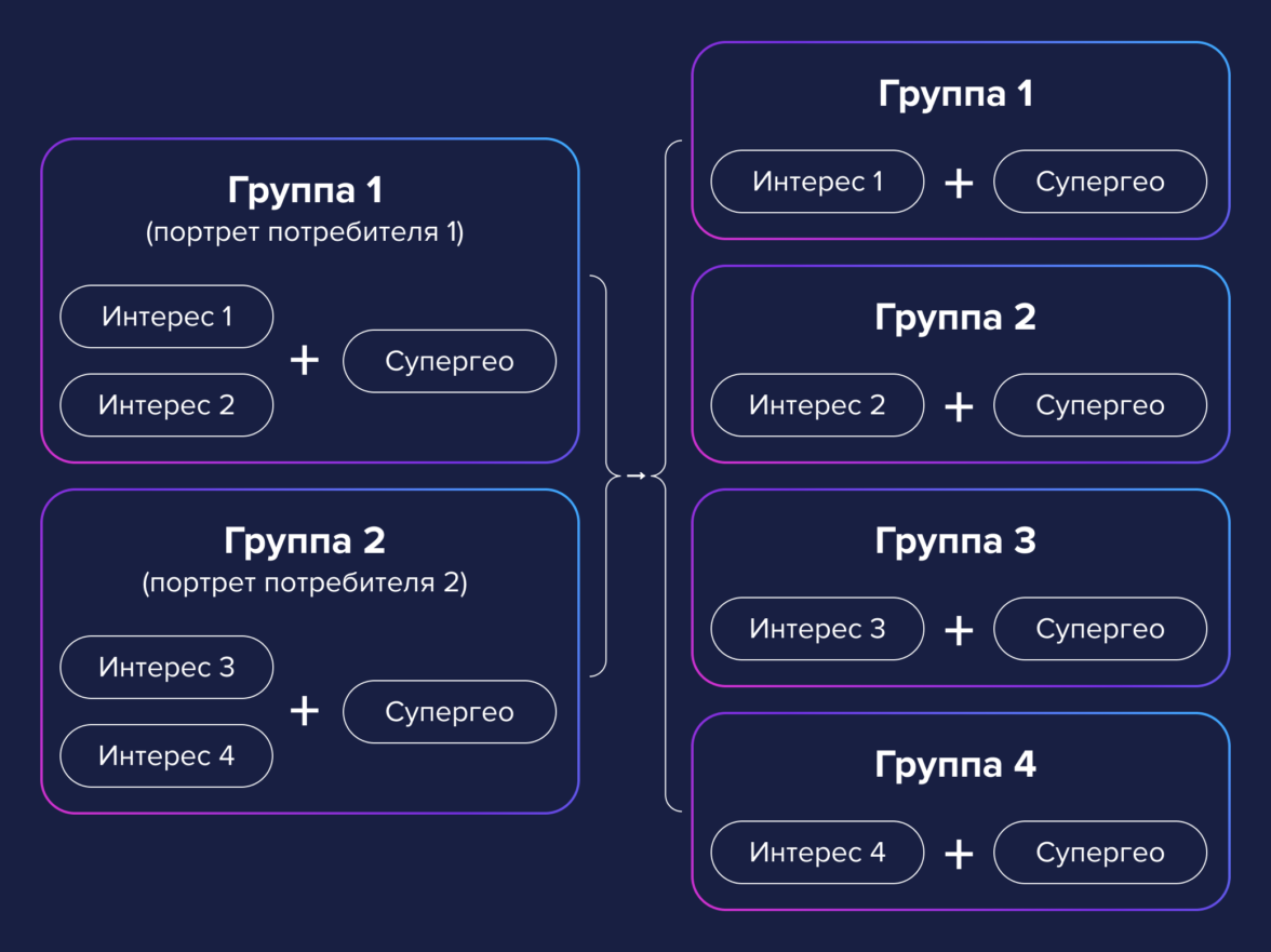 Тогда мы разбили кампанию на более мелкие группы, в каждой из которых задали только один интерес. Сегмент супергео также добавили в каждую группу. В новой разбивке кампания стала работать лучше: наши объявления стали видны достаточному числу пользователей.