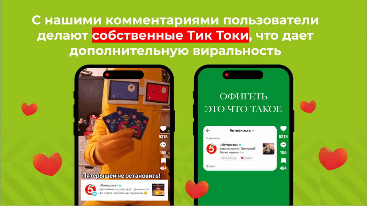 С нашими комментариями пользователи делают собственные Тик Токи, что дает дополнительную виральность. Чем абсурднее и неожиданнее комментарий — тем вероятнее, что пользователь его запостит в Тик Ток.