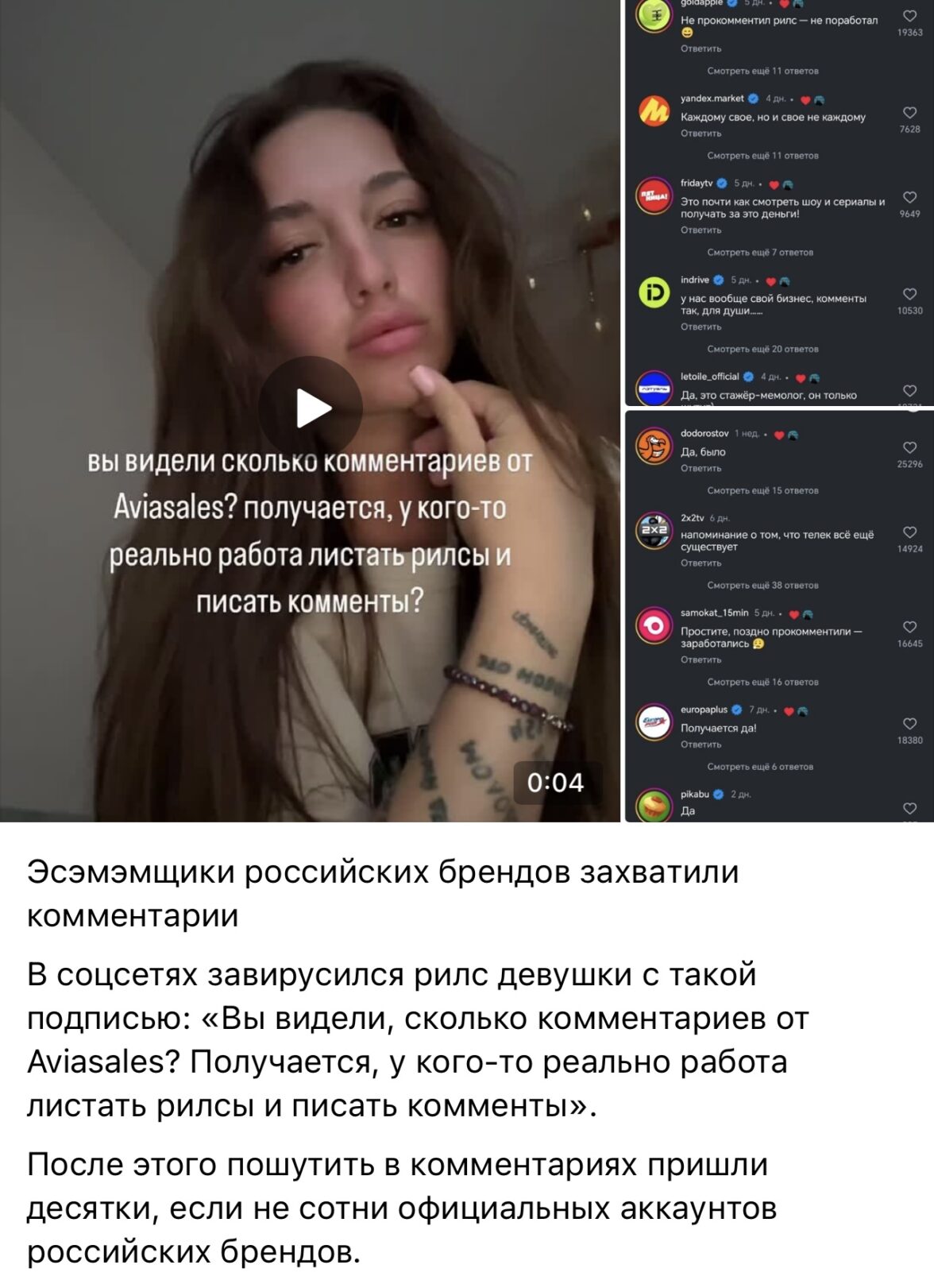 Наверняка вы знакомы с инструментом креативного комьюнити? Если нет — вспомните комментарии под мемными рилсиками от крупных брендов. Вот пример:
