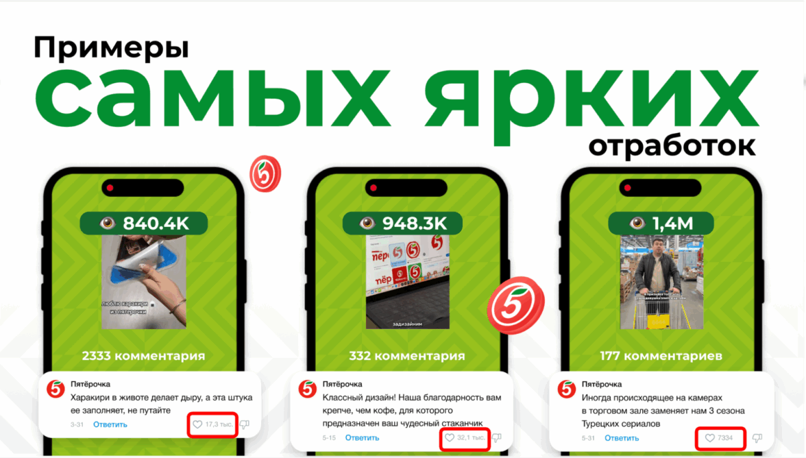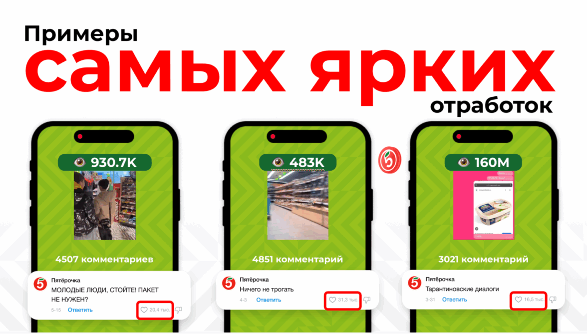 Каждый месяц оставляем 90–120 ироничных или смешных комментариев под релевантными постами вне сообществ «Пятёрочки»