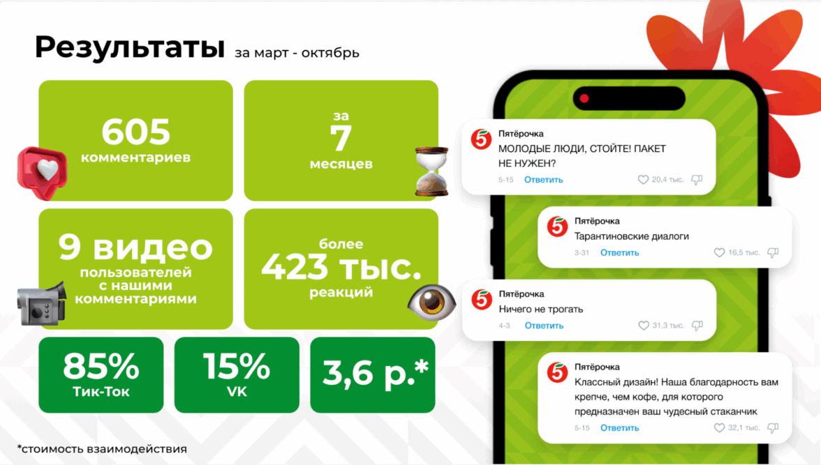 Именно этот инструмент сейчас очень хорошо работает на построение лояльных отношений с аудиторией и помогает повысить узнаваемость. В этой статье мы расскажем, как использовать его наиболее эффективно и достигать классных результатов на примере нашей работы с «Пятёрочкой».