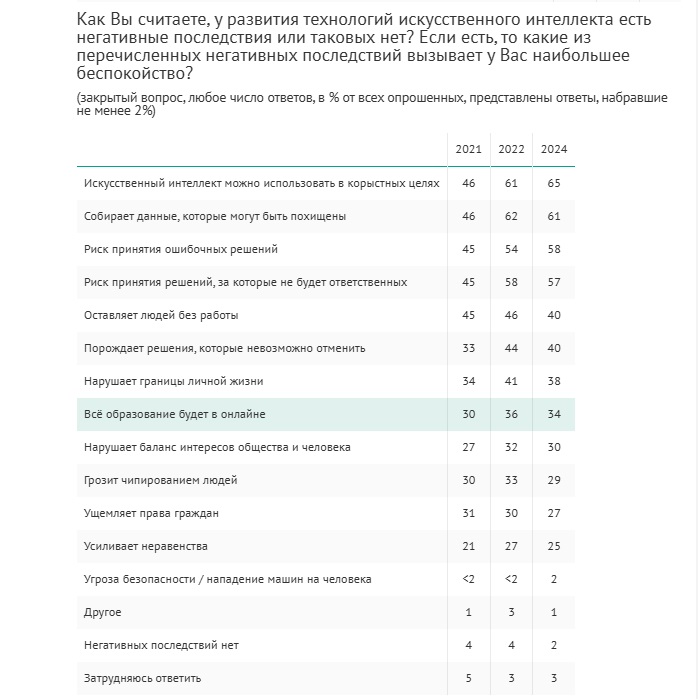 Среди возможных негативных последствий развития технологий ИИ большинство россиян назвало следующие: искусственный интеллект можно использовать в корыстных целях (65%), он собирает данные, которые могут быть похищены (61%), может принимать ошибочные решения (58%) и решения, за которые не будет нести ответственность (57%).