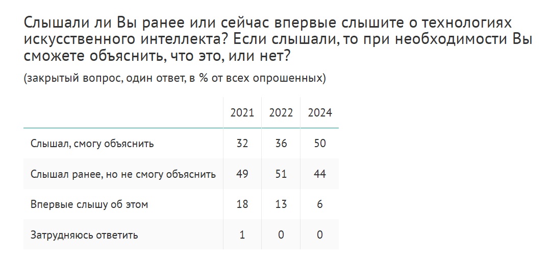 Доля тех, кто не просто слышал, а может объяснить, что же это такое, за прошедшие два года выросла с 36% до 50%. Получается, что уже не каждый третий, а каждый второй россиянин обладает уверенным знанием о ИИ-технологиях.