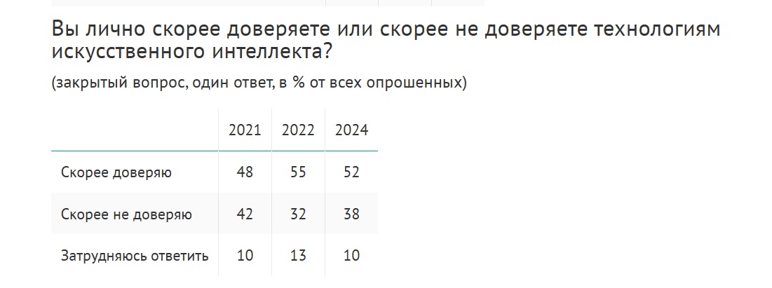 Если уровень информированности россиян о технологиях ИИ уверенно растет год к году, то сказать то же самое об уровне доверия нельзя. За прошедшие три года этот показатель мало изменился. «Скорее доверяют» искусственному интеллекту 52% россиян (два года назад таких было чуть больше – 55%), «скорее не доверяют» – 38% (два года назад таких было меньше – 32%).