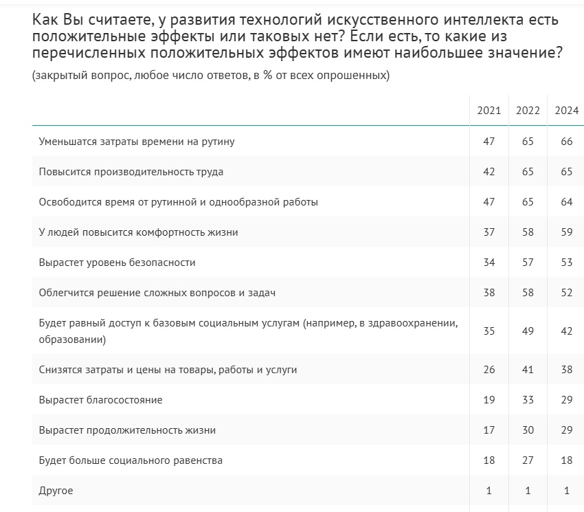 Победа над рутиной – главный положительный эффект, который, по мнению россиян, будет иметь развитие технологий ИИ. 66% респондентов дали ответ «уменьшатся затраты времени на рутину», 64% – «освободится время от рутинной и однообразной работы» (надо заметить, что между двумя ответами не такая уж большая разница). 65% россиян считают, что благодаря ИИ повысится производительность труда, 59% – что повысится комфортность жизни, 53% – что вырастет уровень безопасности, 52% – облегчится решение сложных вопросов и задач. Остальные ответы дали менее половины опрошенных.