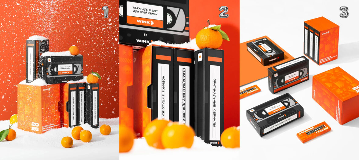 Модульная составная упаковка новогоднего подарка от онлайн-кинотеатра Wink, индивидуальное производство. Внутри каждой «видеокассеты» находится подарок.