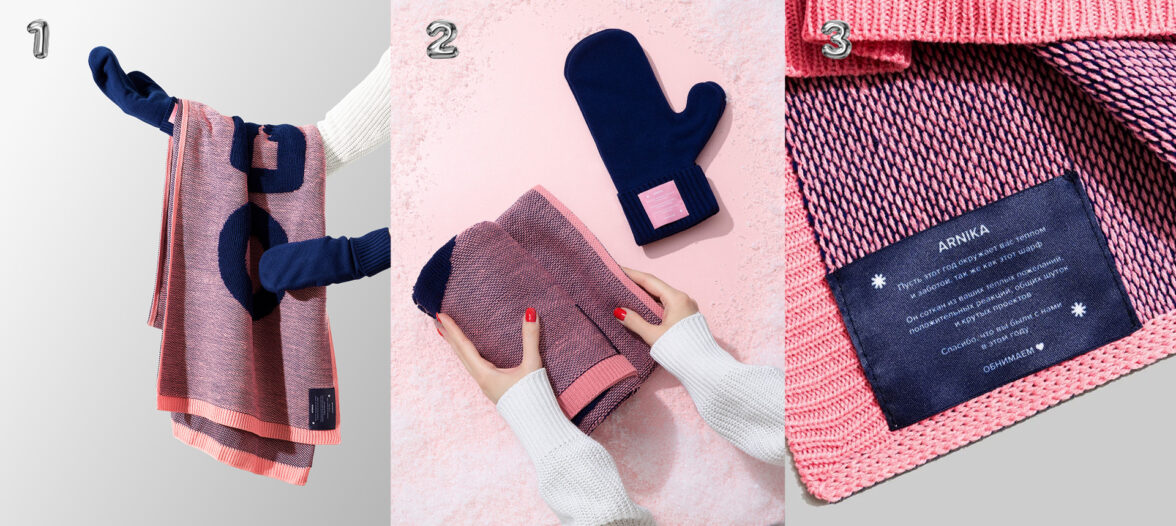 Пример вязаных изделий с индивидуальным дизайном: шарф с объемной надписью из последнего новогоднего подарка от Arnika gifts design.
