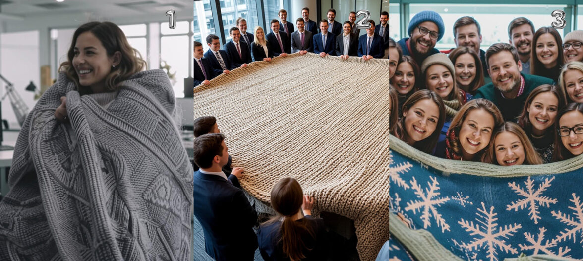 Яркая идея от ИИ больше похожа на арт-объект или реквизит для ивента. Эффектно, но лучше каждому сотруднику подарить плед обычного размера. И тут тоже есть место для фантазии: можно добавить люрекса (блестящих нитей), можно сделать объемные петли, как на махровом полотенце, можно использовать фактурную «узелковую» вязку, имитацию состаренности (distressed yarn), вязать из полушерсти или более бюджетного акрила и многое другое. А начинать разрабатывать дизайн оригинального пледа для новогоднего подарка команде лучше еще летом.