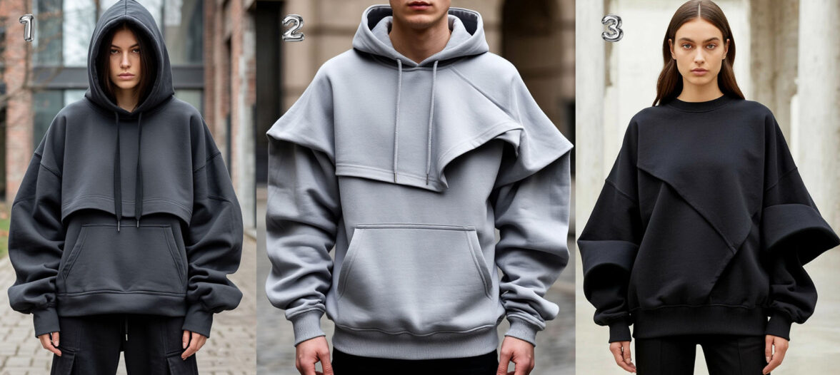 Объемные свитшоты и худи с выразительными драпировками можно сшить из хлопкового футера с начесом, он хорошо держит форму и комфортен для повседневного гардероба. Однако носить эти вещи осенью и зимой будет сложно, поскольку потребуется такая же объемная верхняя одежда.