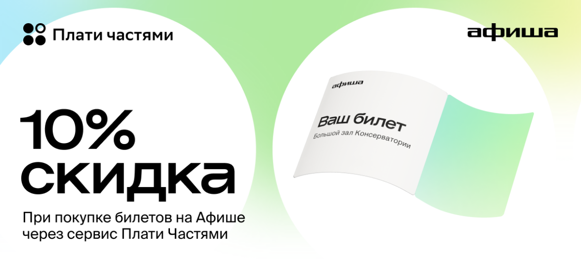Скидка 10% доступна всем покупателям, которые выбрали способ «Плати частями» во время оформления заказа до 31 октября 2024 года. Платёж разобьётся на 4 равные части, которые можно внести в течение полугода. В акции участвуют все популярные концерты и спектакли. Например, иммерсивная драма «Преступление и наказание» в особняке «Дашков, 5», спектакль с Дмитрием Нагиевым «Кыся», вечная классика «Евгений Онегин», «Мастер и Маргарита», «Дон Кихот» и другие постановки, большие концертные шоу Cream Soda, Владимира Преснякова, Дениса Мацуева и других исполнителей.