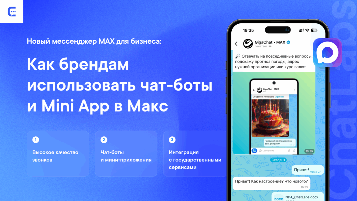 Хотите узнать, как использовать мини-приложения и чат-ботов в MAX для малого, среднего или крупного бизнеса? Просто оставьте заявку в Телеграм @chatlabs_manager или на почту hi@chatlabs.ru. Хотите узнать, как использовать мини-приложения и чат-ботов в MAX, VK, Telegram для малого, среднего или крупного бизнеса? В бесплатном чек-листе разбираем типичные ошибки и как их избежать (особенно когда на кону вопрос инвестиций на сотни тысяч рублей). А еще предлагаем реальные примеры и опыт реализации в кейсах.