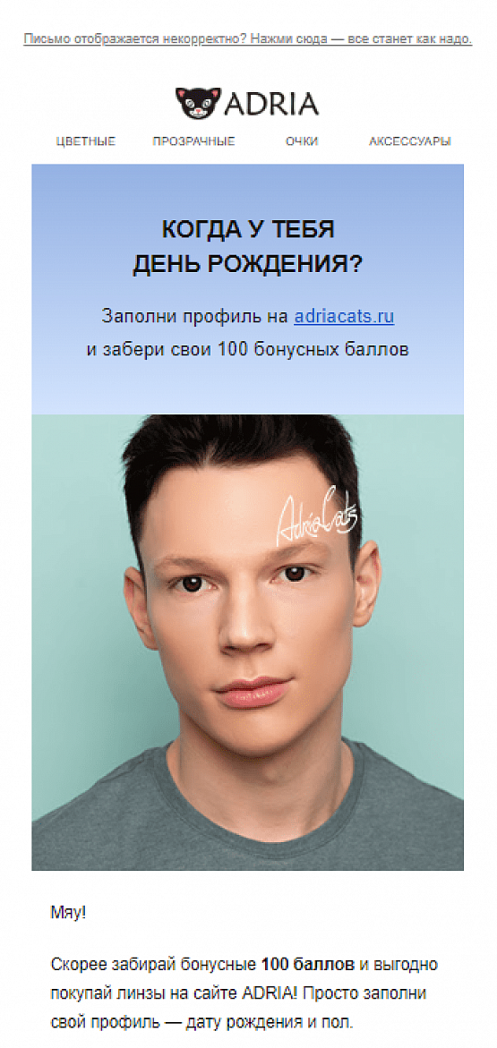 В приветственных письмах можно нативно вовлекать новых подписчиков в программу лояльности. Например, простой способ сделать это — начислить дополнительные бонусы за заполнение профиля. Тогда вы решаете сразу три задачи: