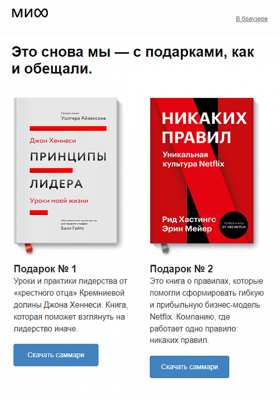 Если человек подписался на рассылку в обмен на что-то, например, на бонусные 500 рублей, бесплатную доставку при первой покупке, экспресс-аудит, то важно в одном из первых писем повторить условия получения. А в идеале — сразу отдать обещанное, если для этого пользователю больше ничего не нужно делать. Так, издательство «МИФ» дарит краткие пересказы двух книг в ответ на подписку.