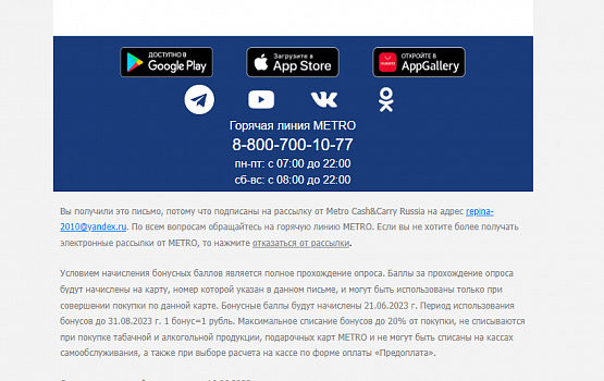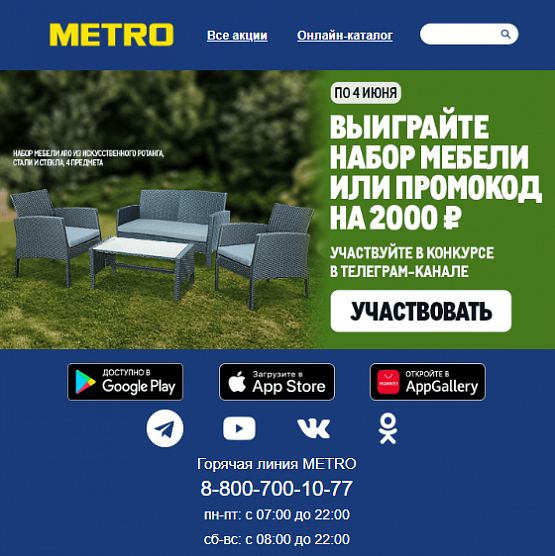 Чтобы больше людей переходило в другие каналы, скачивание мобильного приложения или приглашение в группу в социальных сетях можно сделать основным инфоповодом. Например, та же компания METRO посвятила целое письмо конкурсу в Телеграм-канале: