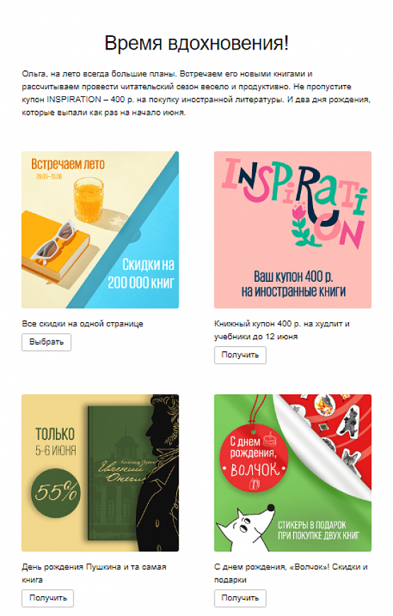 Например, книжный интернет-магазин «Лабиринт» часто пишет о бонусах и скидках в разных категориях книг, чтобы каждый мог выбрать что-то своё.