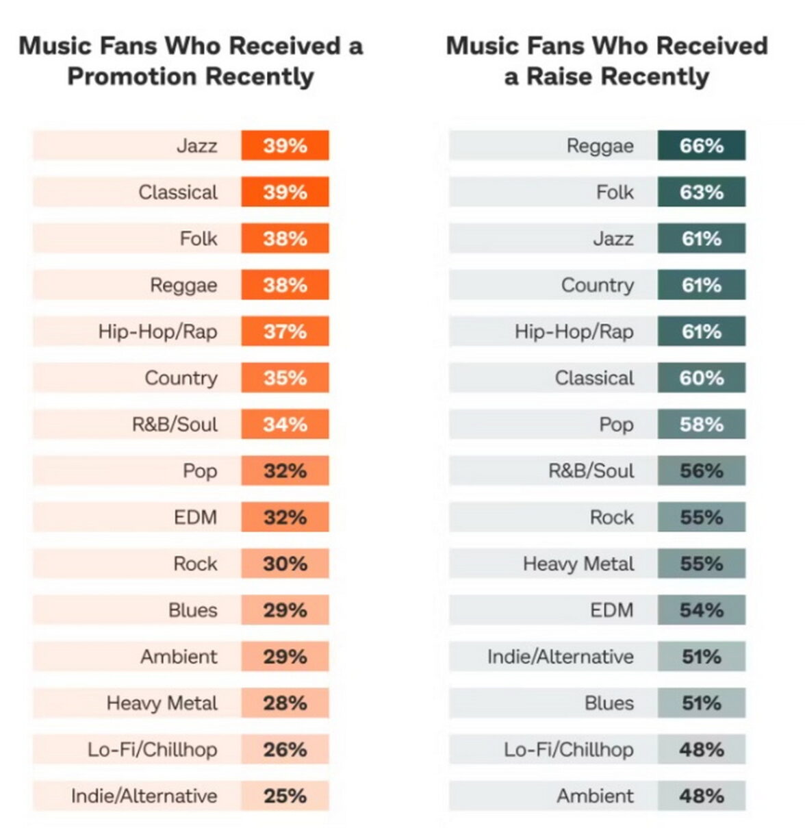 Авторы исследования также выяснили, что прослушивание музыки на работе в течение последних двух лет на 70% повышало шансы заработать повышение и на 18% — получить прибавку к зарплате. При этом карьерному росту сильнее всего способствовали джаз и классическая музыка, а росту зарплаты — регги.