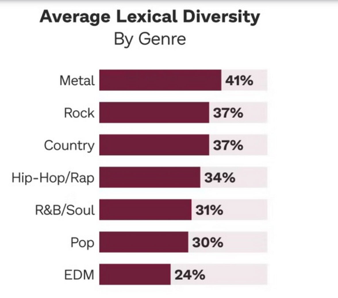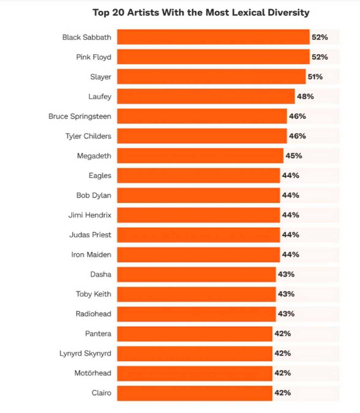 Анализ словарного запаса показал, что чемпионом по лексическому разнообразию является группа Black Sabbath. Лишь немного, доли процента, уступает ей Pink Floyd. «Бронза» — у Slayer.