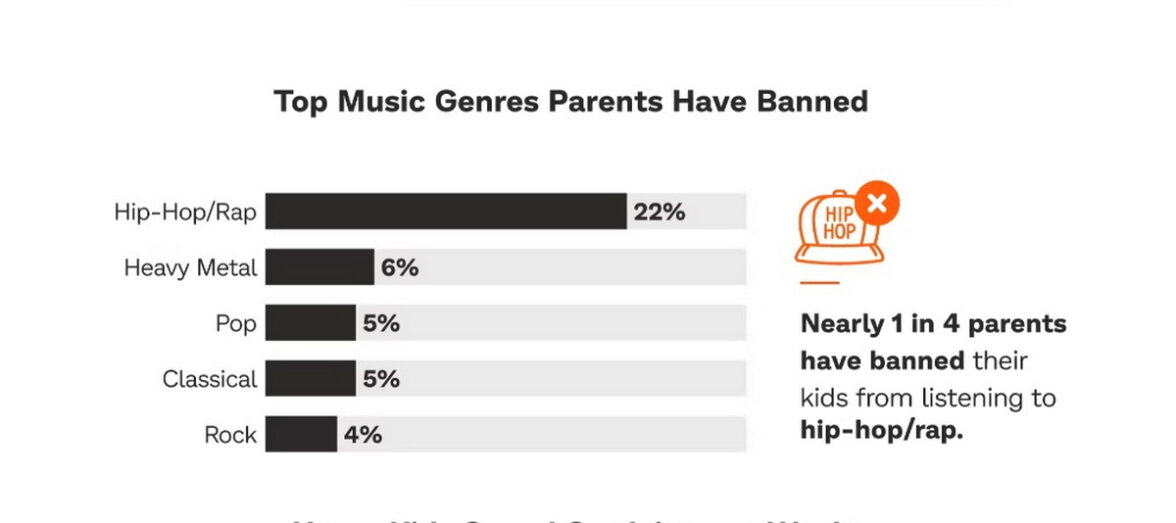 Опрос родителей показал также, что примерно каждый пятый из них (22%) запрещает своим чадам слушать хип-хоп и рэп. Запрет на остальные жанры сравнительно редок — 6% родителей выступают против хэви-метал, 5% — против поп-музыки и классики, 4% против рока.