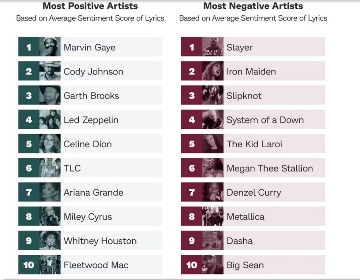 Анализ настроения помог авторам исследования определить самых позитивных и самых негативных музыкантов.
