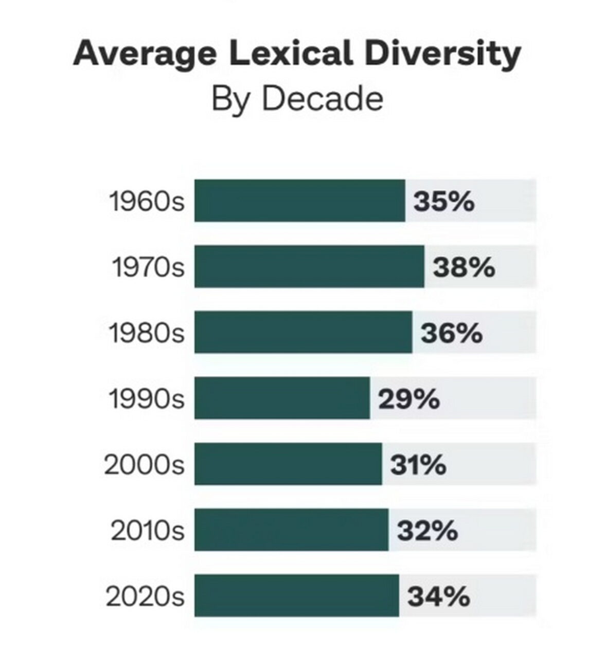 В историческом разрезе самым «интеллектуальным» десятилетием были 1970-е. Тогда лексическое разнообразие песен было на самом высоком уровне. Самые низкие показатели лексического разнообразия — в песнях 1990-х.