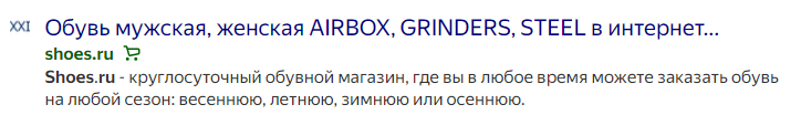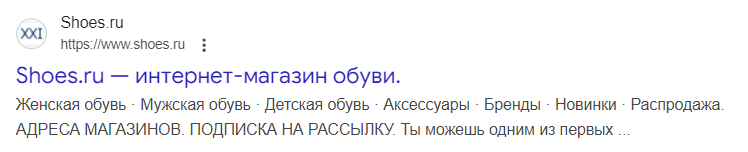Выше я использовал пример Title со страницы обувного магазина, в котором есть несколько ошибок: использовано слишком много символов, присутствует переспам ключами и капс, а акцент сделан на не самый логичный набор брендов. Вот так сниппет выглядит после того, как за дело взялся Google: