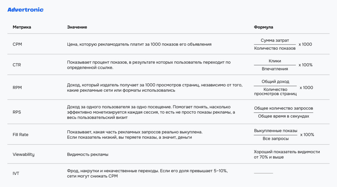 При запуске рекламы владелец сайта сталкивается с десятками показателей: CPM, CTR, Fill Rate, Viewability, RPM, RPS, IVT. Кажется, что легко запутаться, но все проще, и в этой статье партнер по монетизации сайтов – Advertronic– расскажет, на что и зачем смотреть при монетизации сайтов.