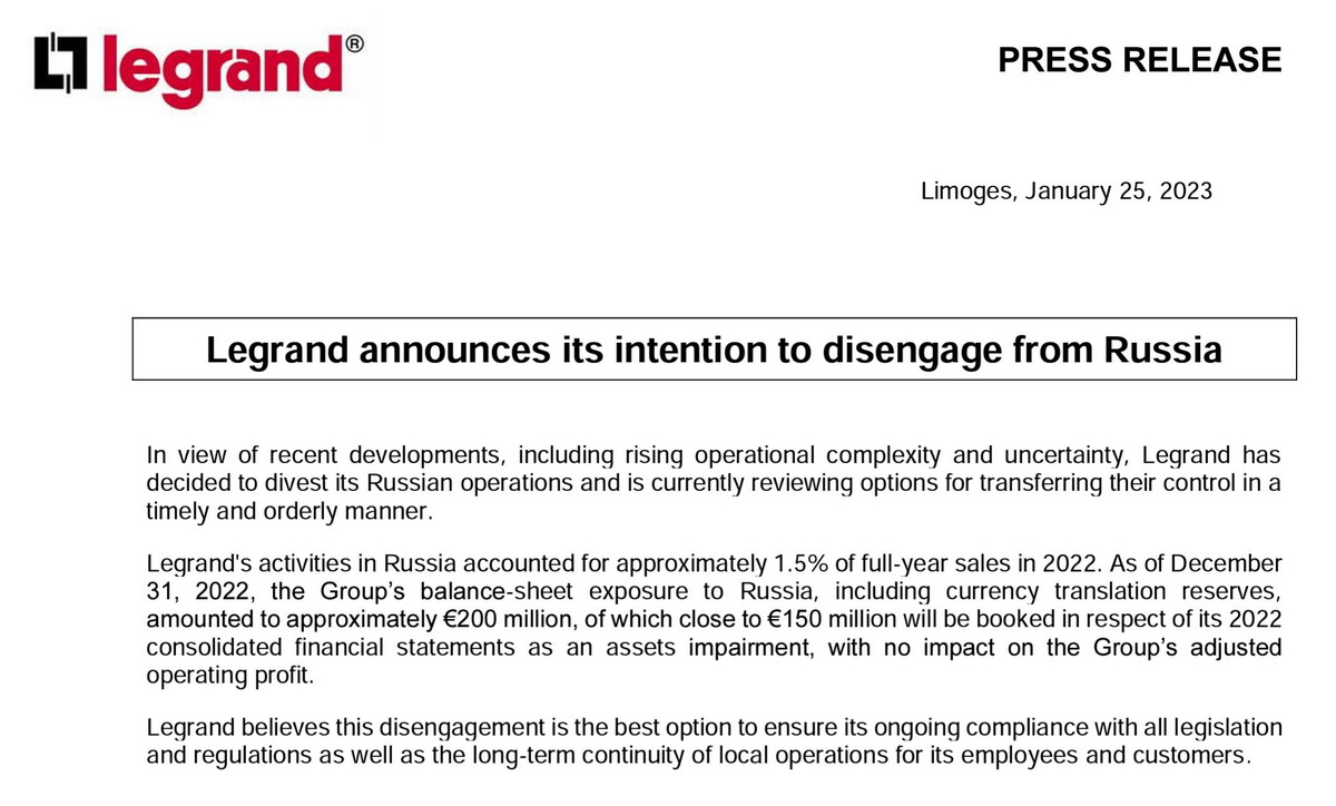 25 января 2023 года на сайте Legrand появилось сообщение, в котором говорилось о намерении свернуть свою деятельность в России. «В свете меняющейся ситуации, в частности растущих операционных трудностей и неопределенности, Legrand решила уйти из России и рассматривает различные варианты, чтобы обеспечить передачу своего бизнеса на наилучших условиях», — заявили в компании. В сообщении указывалось, что в 2022 году на продажи в России пришлось 1,5% от общих объемов продаж компании. Свои убытки от ухода с российского рынка Legrand оценил в €150 млн.