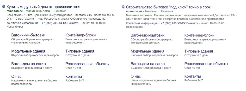 Яндекс учитывает качество объявлений при определении их позиции в результатах поиска. Полное заполнение всех полей (заголовок, текст, ссылки, изображения) повысит рейтинг нашего объявления и снизит CPC (стоимость за клик) и, соответственно, стоимость лида.
