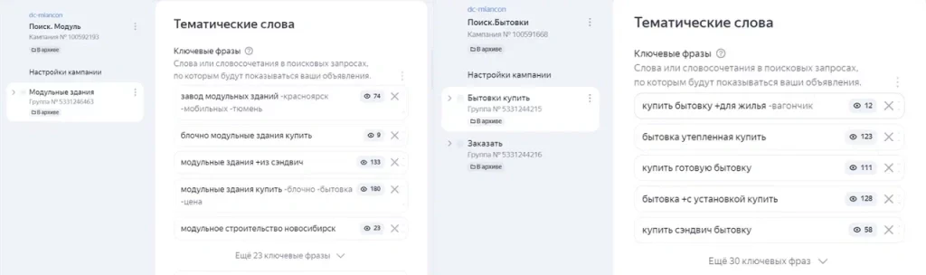 Собрали семантическое ядро. Подобрали ключевые фразы и сгруппировали на уровне кампаний —по следующим категориям: