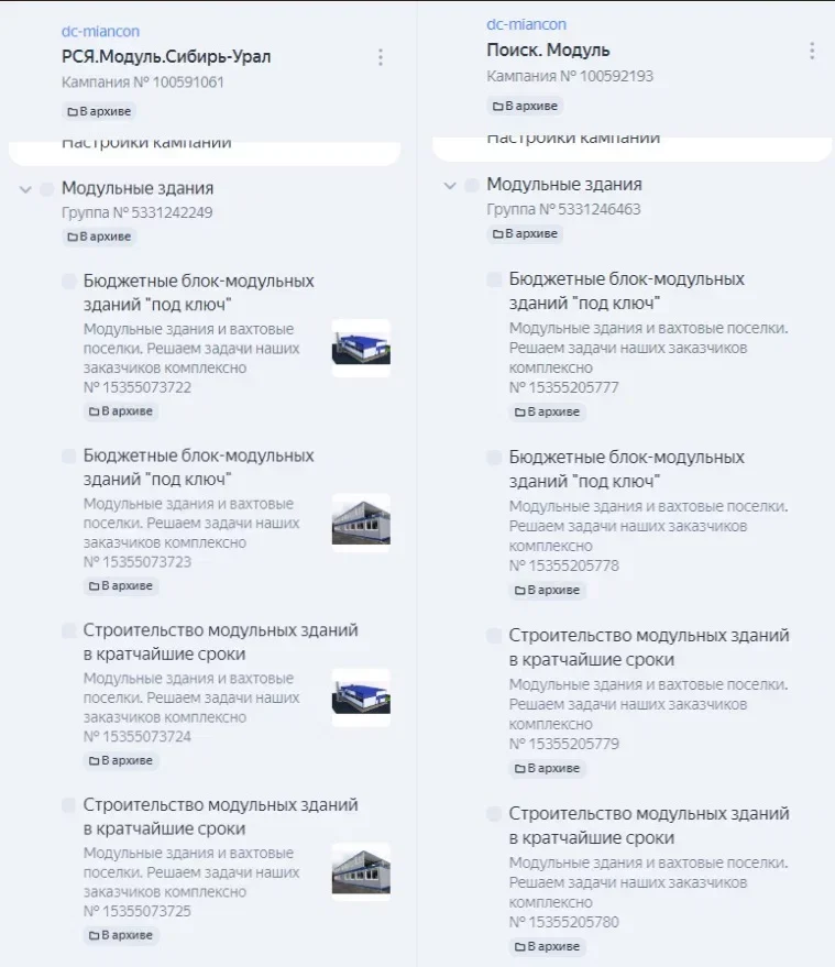 Настройки рекламных кампаний подрядчика на уровне объявлений