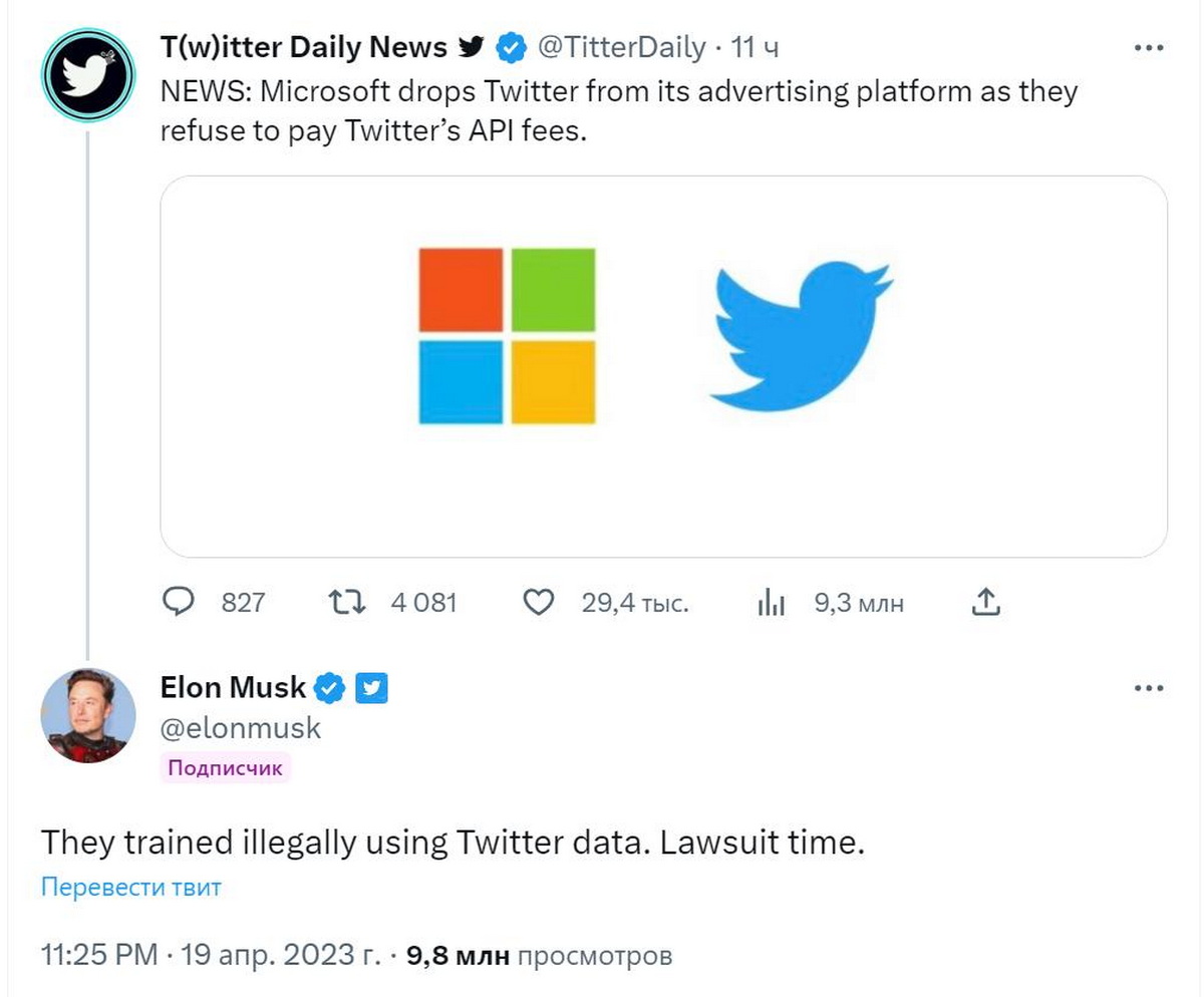 Неудивительно, что Илон Маск резко отреагировал на решение Microsoft. На фоне потери почти половины из ключевых рекламодателей и драматического падения капитализации Twitter оно выглядит особенно болезненно. Маск обвинил Microsoft в незаконном использовании данных соцсети для обучения искусственного интеллекта (ИИ) OpenAI и даже пригрозил ей судом.