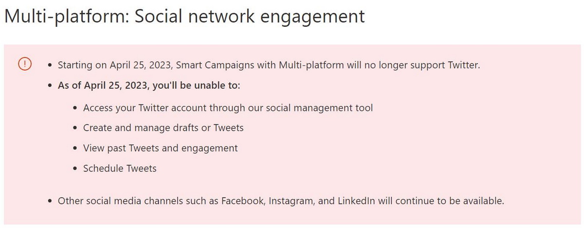 В заявлении Microsoft своим клиентам говорится, что начиная с 25 апреля 2023 года сервисы Microsoft Smart Campaigns и Digital Marketing Center больше не будет поддерживать работу с Twitter. Это изменение означает, что пользователи рекламно-маркетинговой платформы корпорации больше не будут иметь доступ к своей учетной записи в соцсети, а также создавать, планировать или иным образом управлять твитами через бесплатную службу управления социальными сетями Microsoft. С 25 апреля, используя платформы корпорации, они смогут управлять аккаунтами и создавать контент только для Facebook*, Instagram* и LinkedIn.